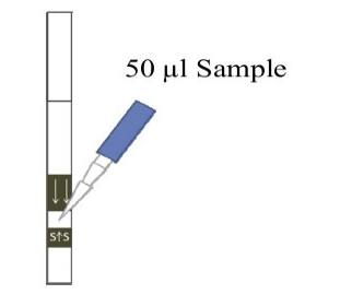 2. 样本底板上(sample pad )加50ul的试验样本,样本底板位置在箭头的之间,见下图。不要将样本加至缓冲液底板(buffer pad )